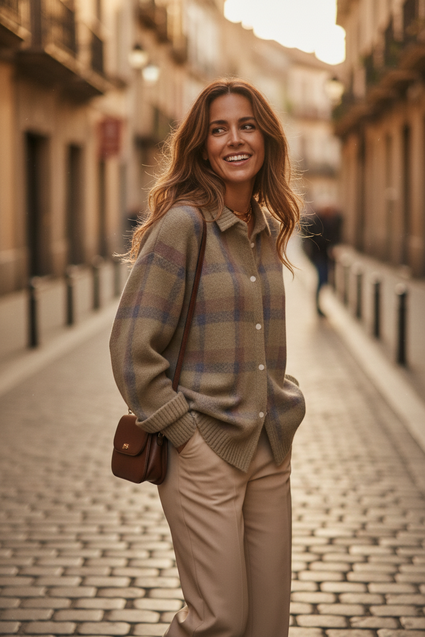 Este cárdigan combina el clásico estampado a cuadros con un tejido de punto suave que ofrece calidez y estilo en cada momento. Ideal para días casuales, para capas adicionales en mañanas frescas o para aportar un toque retro a cualquier conjunto.